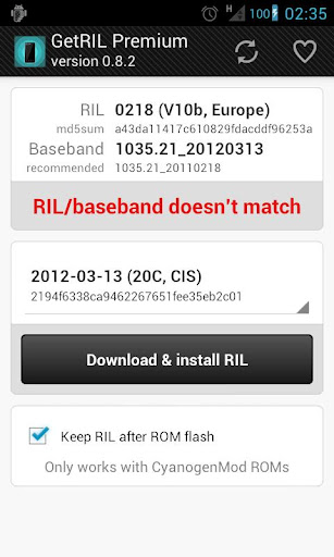 GetRIL shows the device's current RIL (Radio Interface Layer) and baseband, notifying you if they match or not. If not - and you're on a rooted device - you'll be able to download and install a new matching RIL.